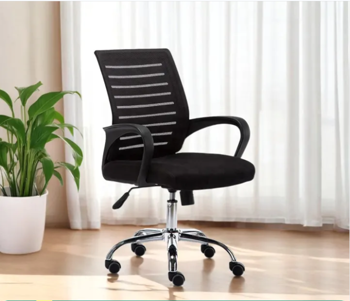 The office chair is upholstered with mesh fabric/rexine that is comfortable yet durable, making it a smart and stylish solution to any application.With no traditional seat or back board used, this chair provides long lasting support and comfort like no other. It features chrome accents and a slim profile which provide a contemporary look and maximum durability. It also offers simple and intuitive controls such as pneumatic seat height adjustment, 360 degree swivel, tilt tension and tilt lock for added customizability and comfort.